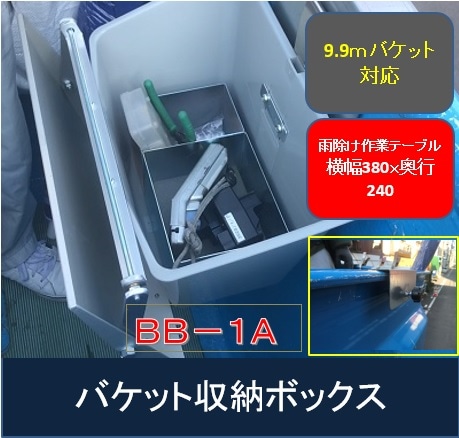 使いたいときにそこにあるを実現!工具のバケットの走行中のバウンドや雨濡れにも心配無用になるフタ付→工具や部材を載せて置ける改良版 バケット取付収納ボックスBB-1A高所作業車両 バケット 関連器具通信工事機器専門店 工事作業楽々サポートショップ。