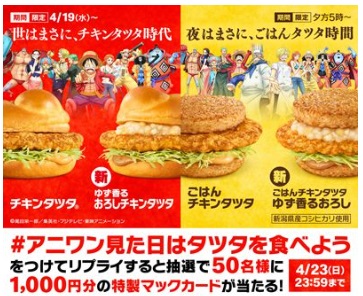 マクドナルド 今年のチキンタツタは「ONE PIECE」とコラボ マックカード・dポイントをもらえるキャンペーン。
