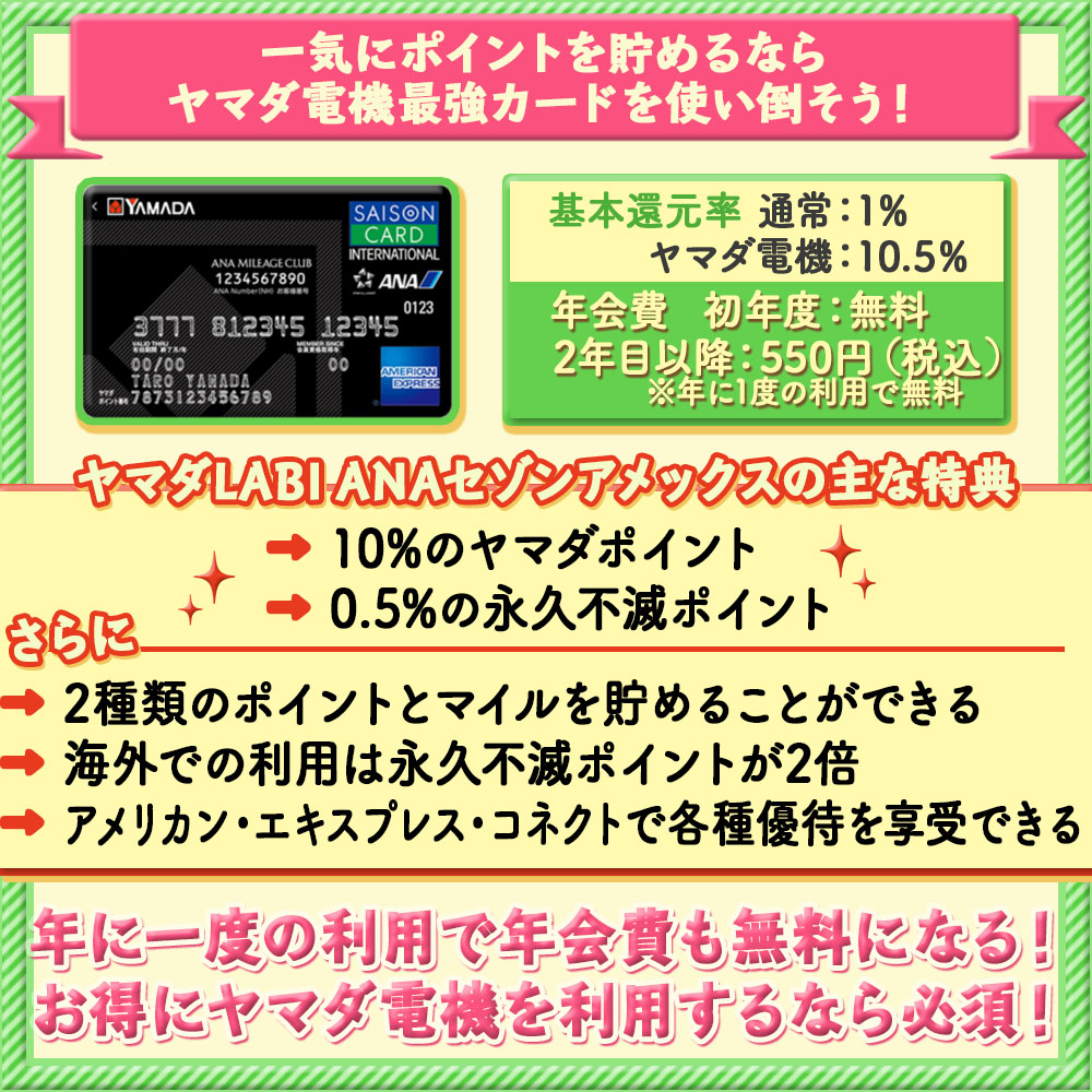10.5%ポイント還元!ヤマダ電機でお得に買い物するならクレカ!ヤマダLABI ANAマイレージクラブカードセゾン・アメリカン・エキスプレス・カードポモチ。