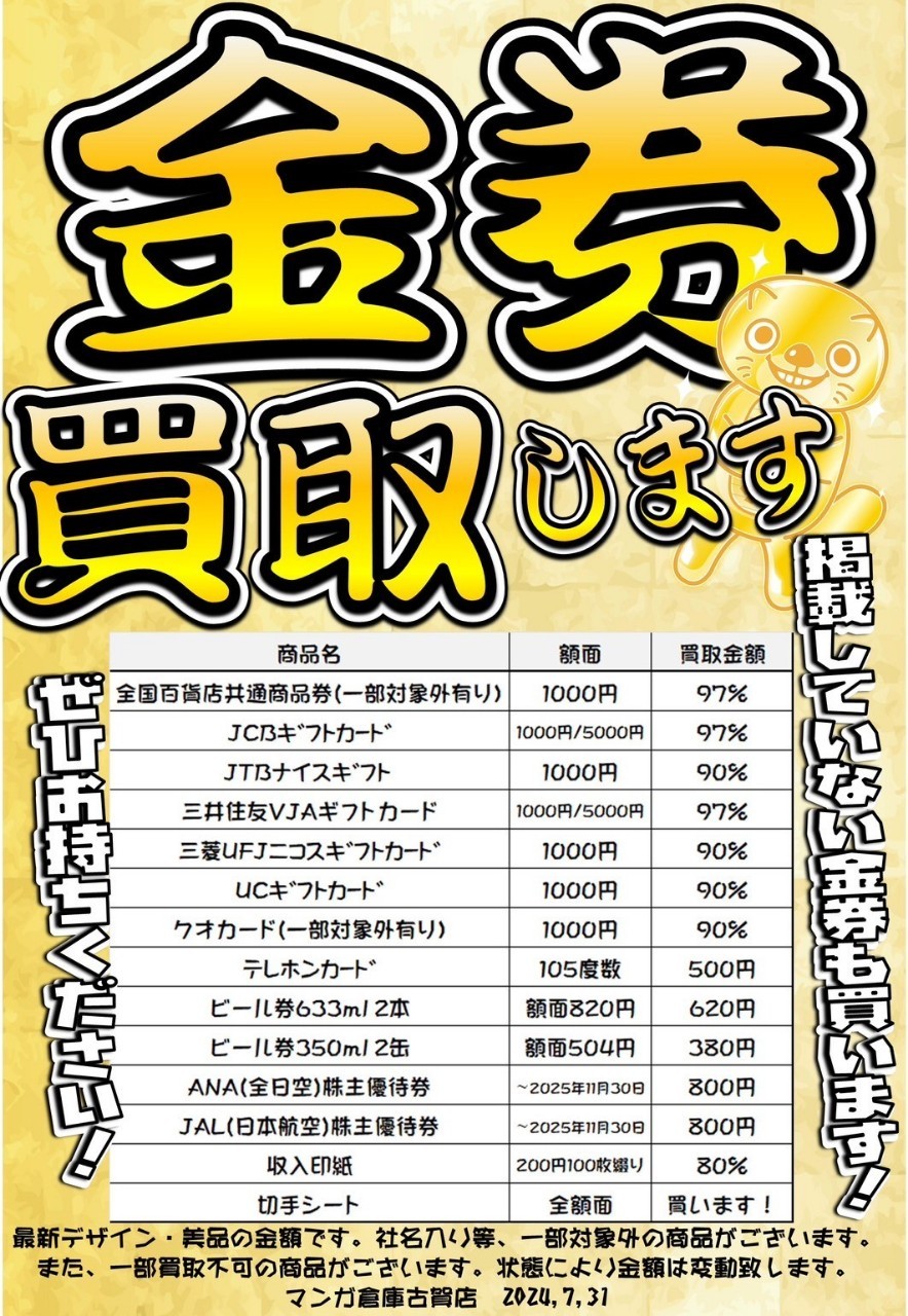 □JCBギフトカード、三井住友VJAギフトカード、全国百貨店共通商品券買取中!□ - マンガ倉庫 古賀店。