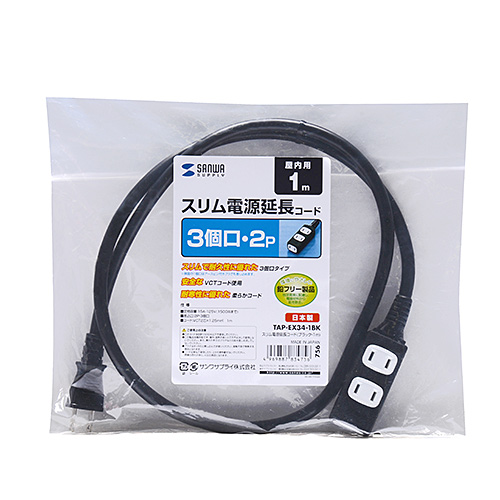スリム電源延長コード 2P・3個口・1m・ブラックTAP-EX34-1BK激安通販のイーサプライ。