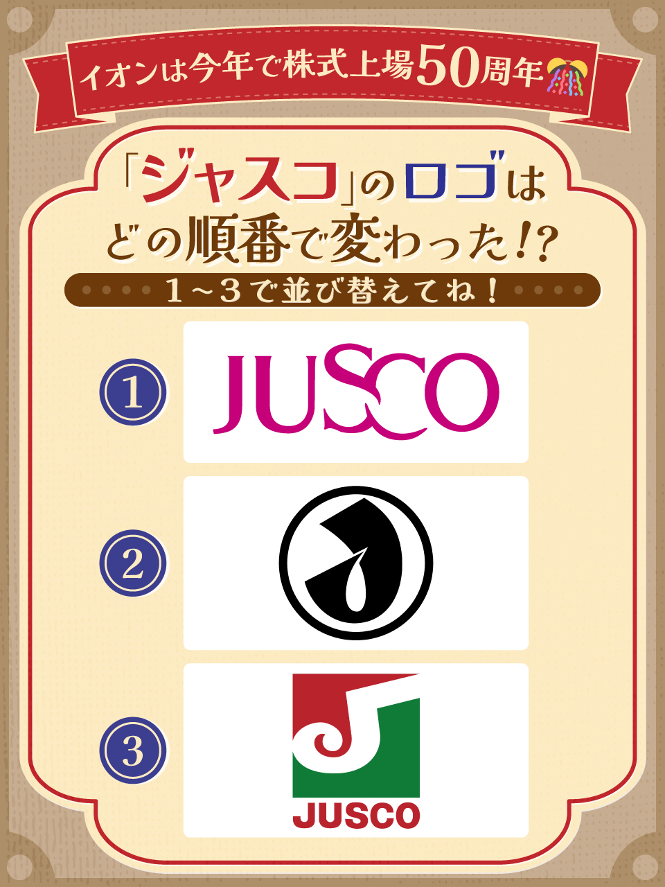 イオン on X: " イオン は今年で株式上場50周年🎊 50年前の社名は『 ジャスコ』でした😌🌿 突然ですが 💥クイズです! 🗣💬『 ジャスコ』のロゴは どの順番で変わったでしょうか❓  ̄ ̄ ̄ ̄ ̄ ̄ ̄ ̄ ̄ ̄ ̄ ̄ ̄ ̄ 1⃣~3⃣で並べ替えてね✨ ジャスコの思い出もあればぜひ。