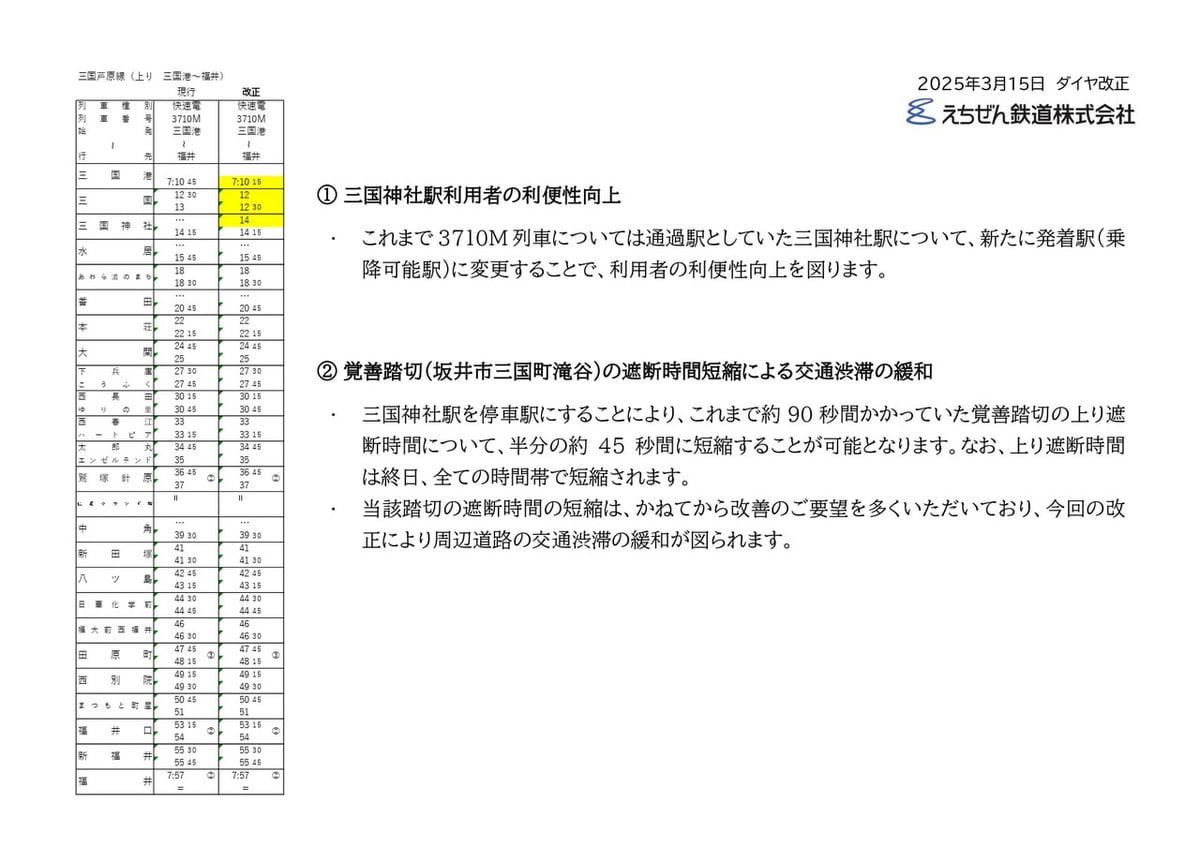 令和7年3月15日 ダイヤ改正について - お知らせ - えちぜん鉄道。