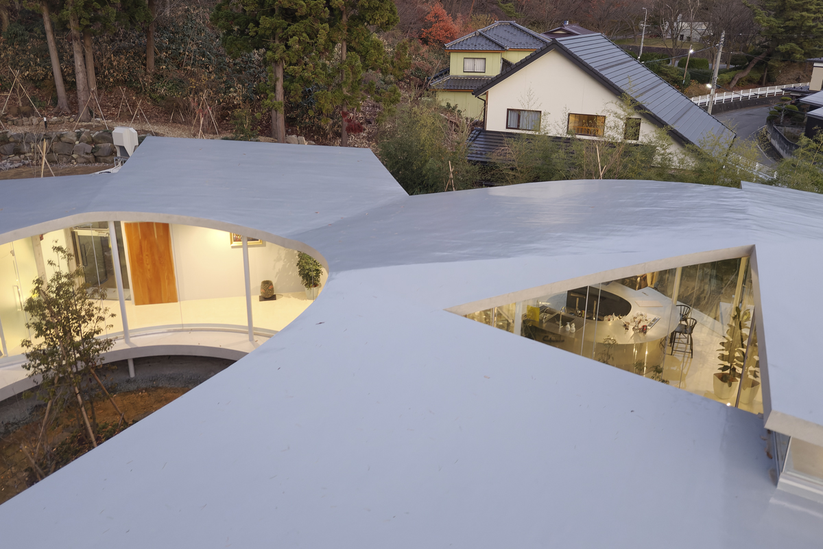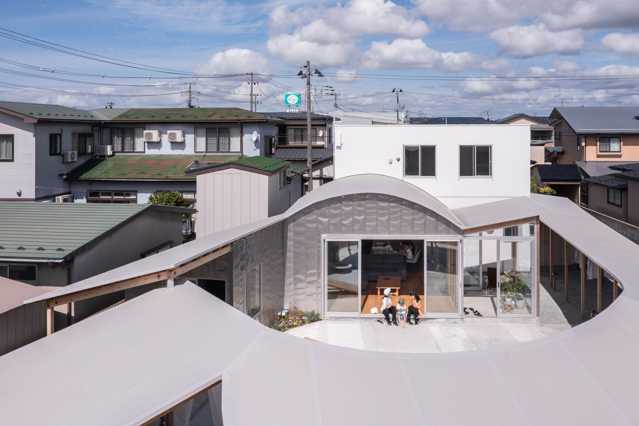 工藤浩平建築設計 事務所による、埼玉・吉川市の「バレエ教室のある家」。周囲で建替えが進む“変わり続ける”地域。未来の変化を許容する“大らかな”存在を目指し、箱を“寄せ集める”様に計画して“生活の余白”が散在する 建築を構築。細かな屋根の集合で街並のスケールとも調和。