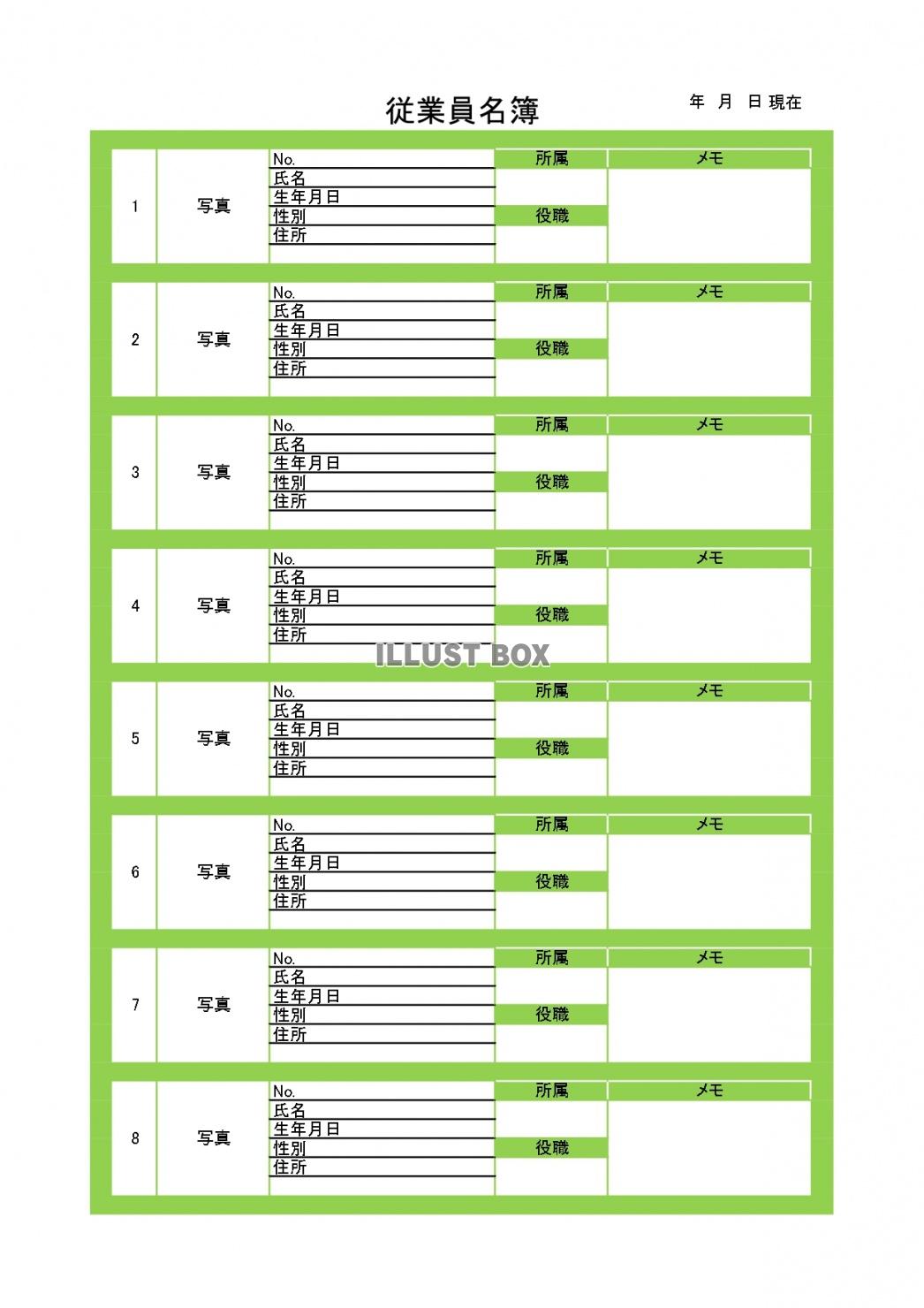 Excel エクセル写真 従業員名簿 一覧 のテンプレート:イラスト無料。