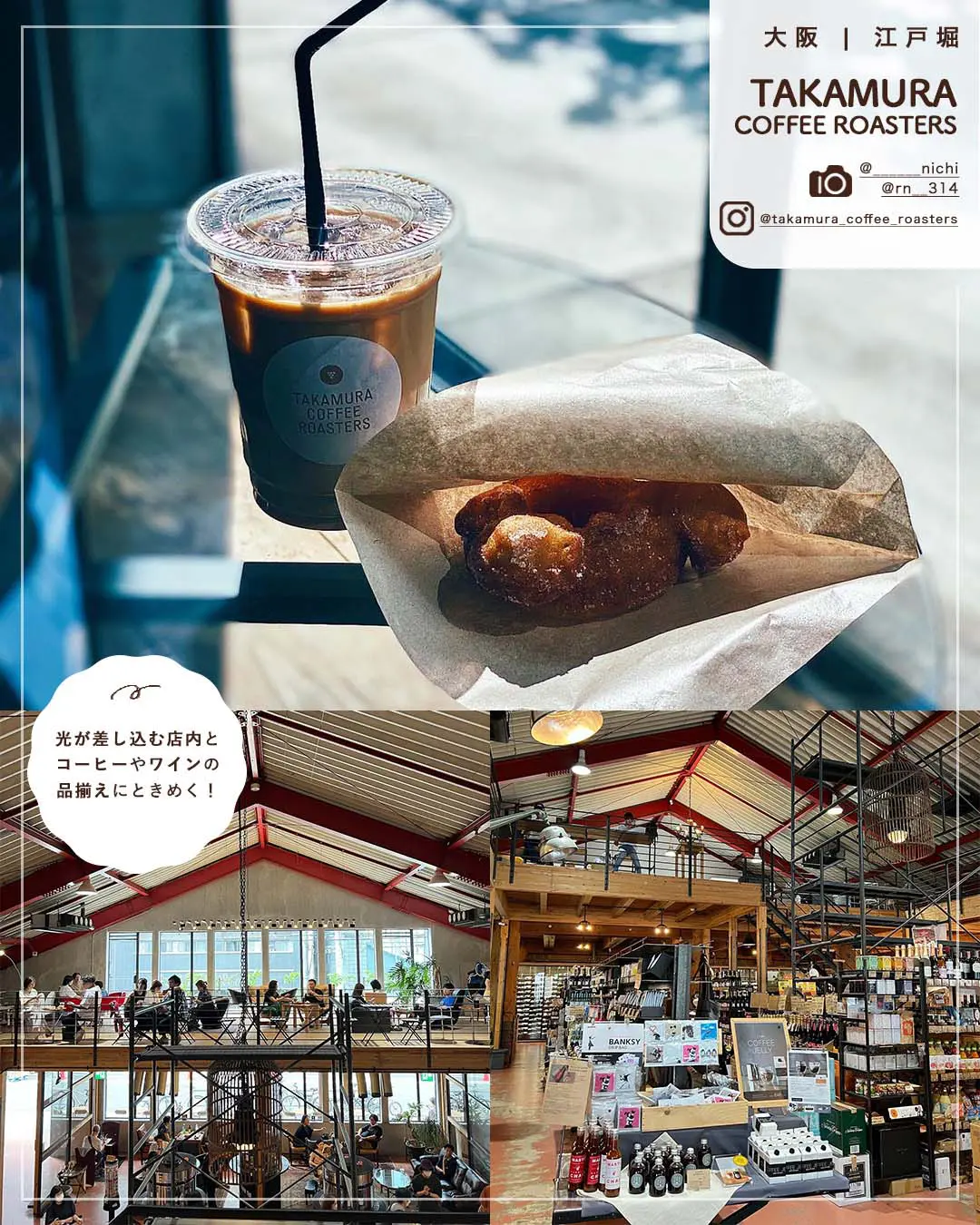 コーヒーの匂いに包まれた広々倉庫カフェ!,大阪観光を愉しむお出かけ発信🏳️, >> 10秒で行きたくなる大阪の魅力をお届け!, >>@osaka.neotravel,, 📍タカムラワイン&コーヒーロースターズ,料金, ⚫︎ アイスカプチーノ600円, ⚫︎ カフェラテ 400円, ⚫︎ 自家製ドーナツ プレーン 230円,。