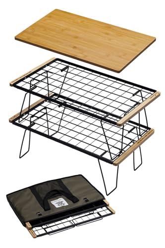 Amazonフィールドラック 4点セット グラウンドラック メタルラック スタック可能 スチール製 アウトドアテーブル 折りたたみテーブル耐荷重30kg 収納袋付き 天板付きkurasiyaテーブル。