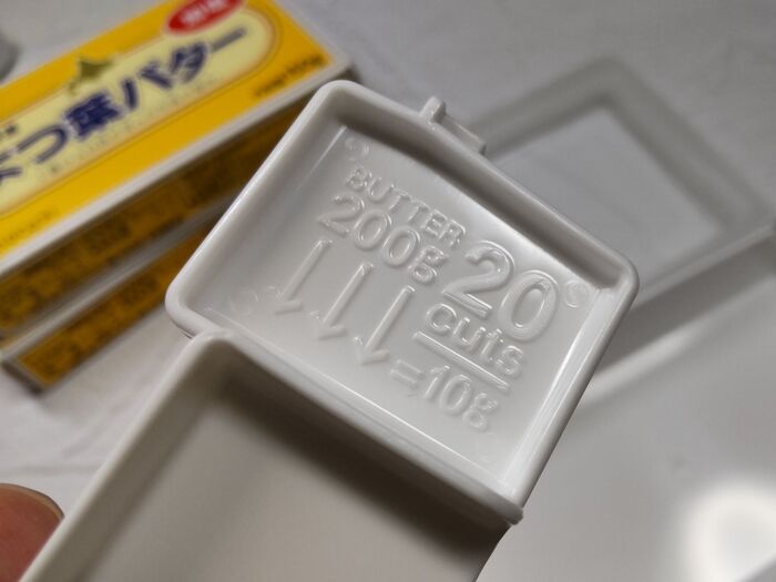 ダイソー使用ルポ L字のバターカッターでさくっと切れる。バターケースが良品すぎて脱帽イエモネ。
