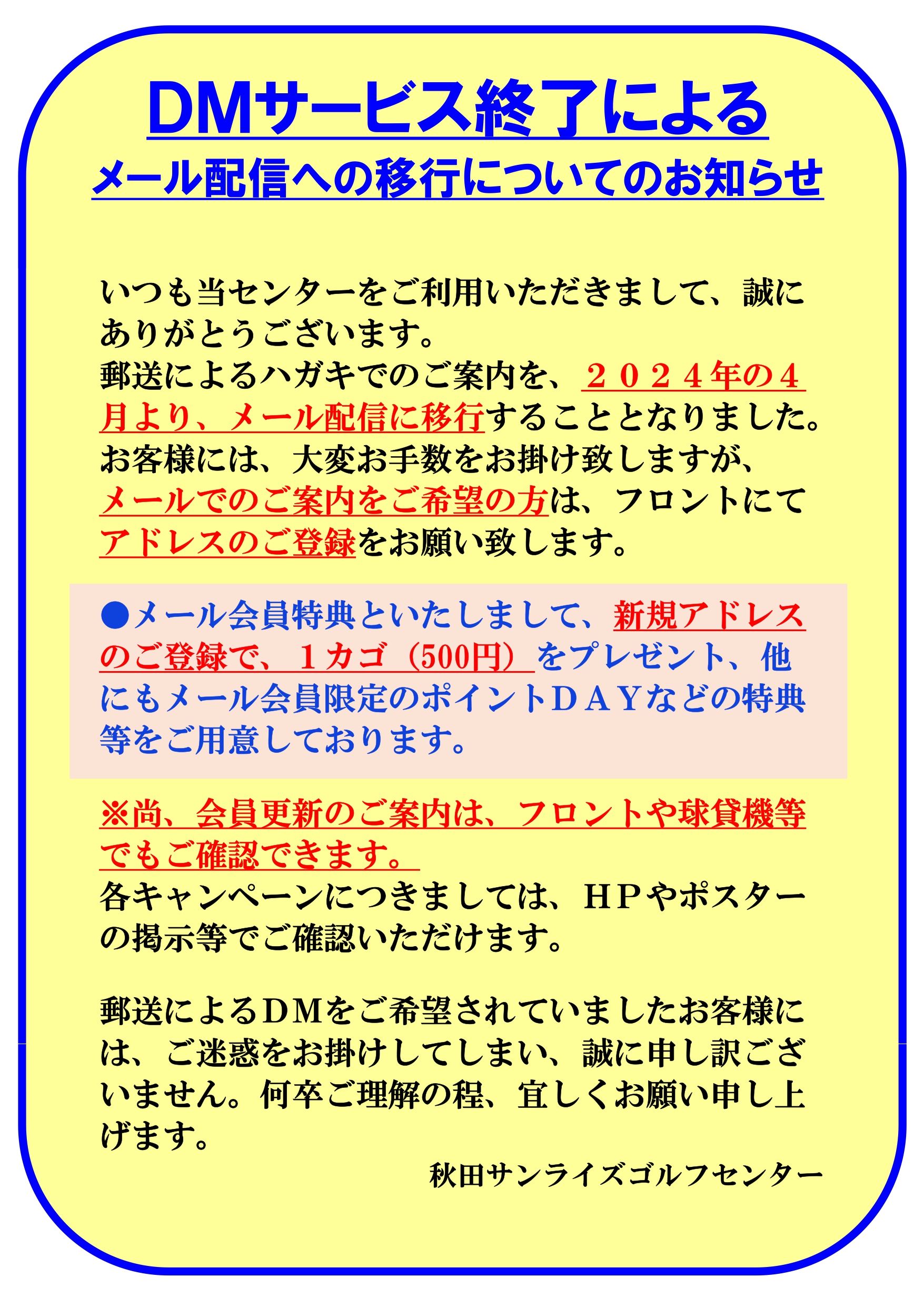 DMサービス終了によるメール配信への移行についてのお知らせ秋田サンライズゴルフセンタ。