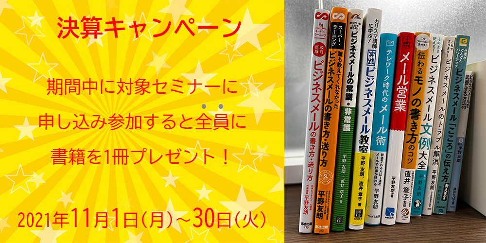 期間限定 書籍プレゼントキャンペーンのお知らせ 11月1日~30日申込分一般社団法人日本ビジネスメール協会。