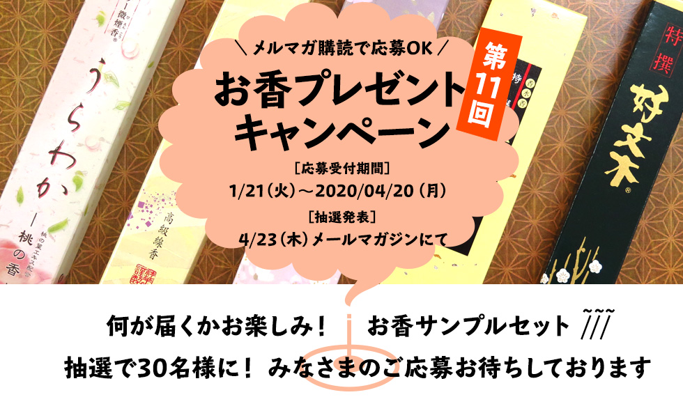 終了 メルマガ購読でエントリーOK!抽選で30名様に当たる!第11回お香プレゼントキャンペーン香源。
