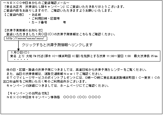 東名お正月 渋滞減らし隊キャンペーン」を実施します-事前に登録していただくと、渋滞予測情報をお知らせするとともに抽選でETCマイレージポイントをプレゼント-2014年2月以前のニュースリリースプレスルーム企業情報高速道路・高速情報はNEXCO 中日本。