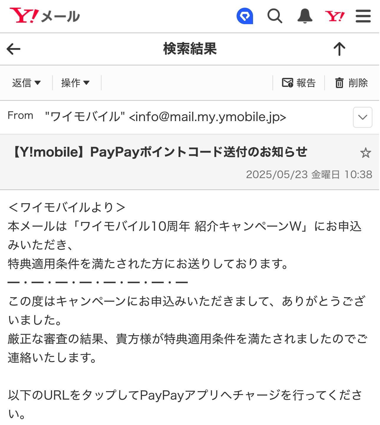 たこやきまん🐙 on X: "ワイモバイル 紹介キャンペーンW 1月登録分がメールに来てる1回線5,000円利益が上乗せされるのデカすぎる。回線契約後にエントリーするシステム、自分で自分を紹介って形にすることも可能。 メール件名: Y!mobile PayPayポイントコード送付の。