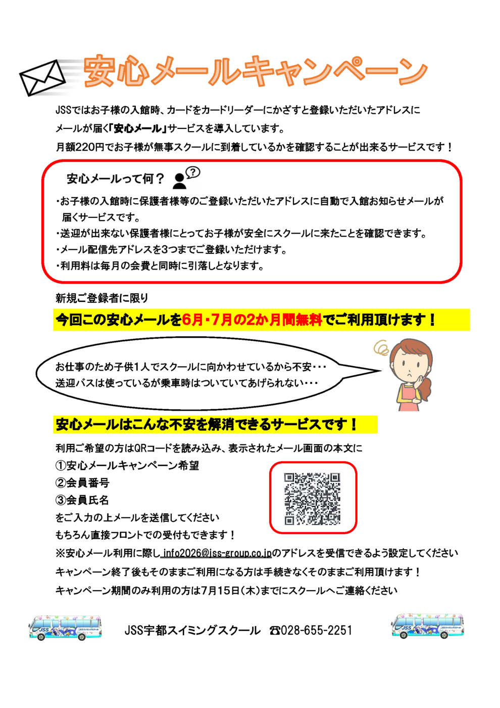 安心メール無料配信キャンペーンのお知らせJSS宇都宮スイミングスクール。