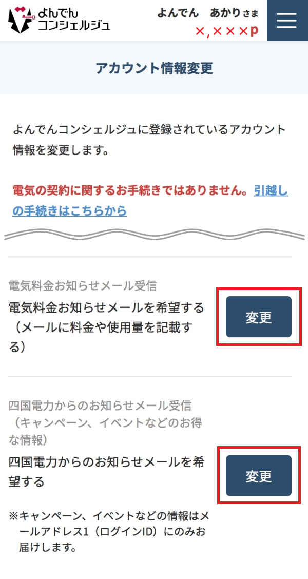 電気料金お知らせメール」や「四国電力からのお知らせメール」の受信設定を変更したい。よんでんコンシェルジュ。