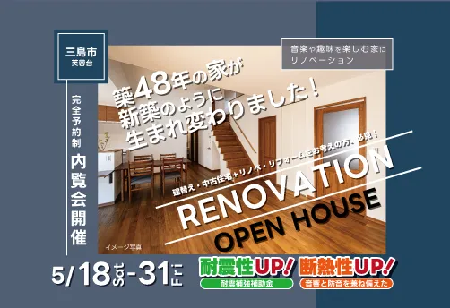 イベント終了 築48年フルリノベーション内覧会「耐震性・断熱性UPも使い勝手も叶えた」 イデキョウホーム富士市・富士宮市でリフォーム・リノベーション。