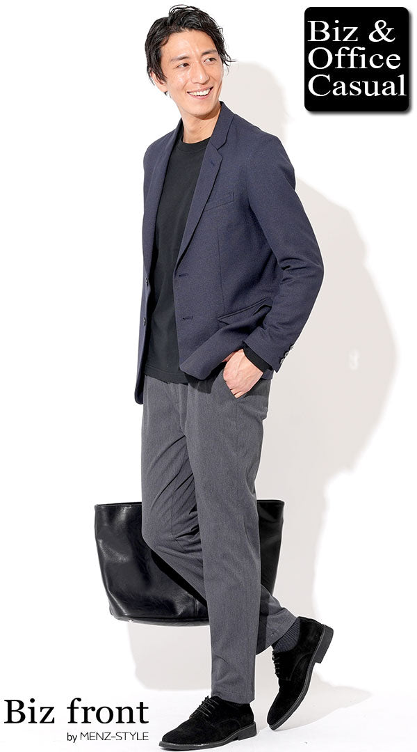 ネイビーテーラードジャケット×黒長袖Tシャツ×グレーテーパードスラックスチノパン biz22aw_5001のコーディネート例ビジネス ・オフィス・スマートカジュアル専門通販。