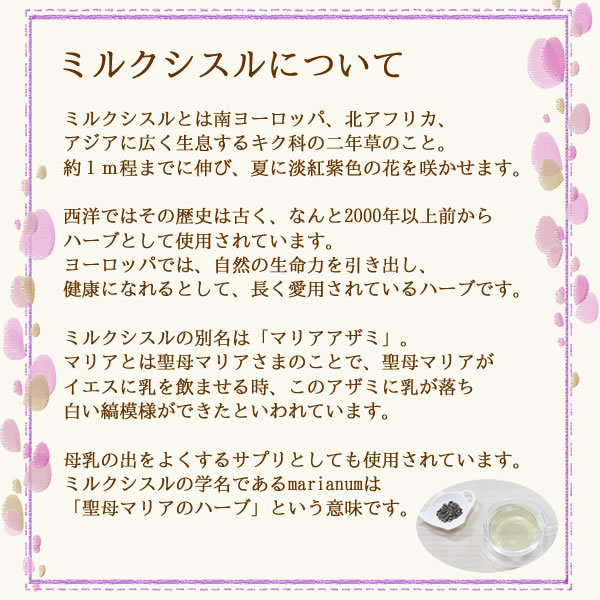 ヴィーナース ミルクシスル 100g ホール送料無料 農薬検査済 みるくしする マリアアザミ シード 種子 ハーブティー 茶 ノンカフェイン 生薬漢方 : ヴィーナース・ハーブティー専門店 - 通販 - Yahoo!ショッピング。