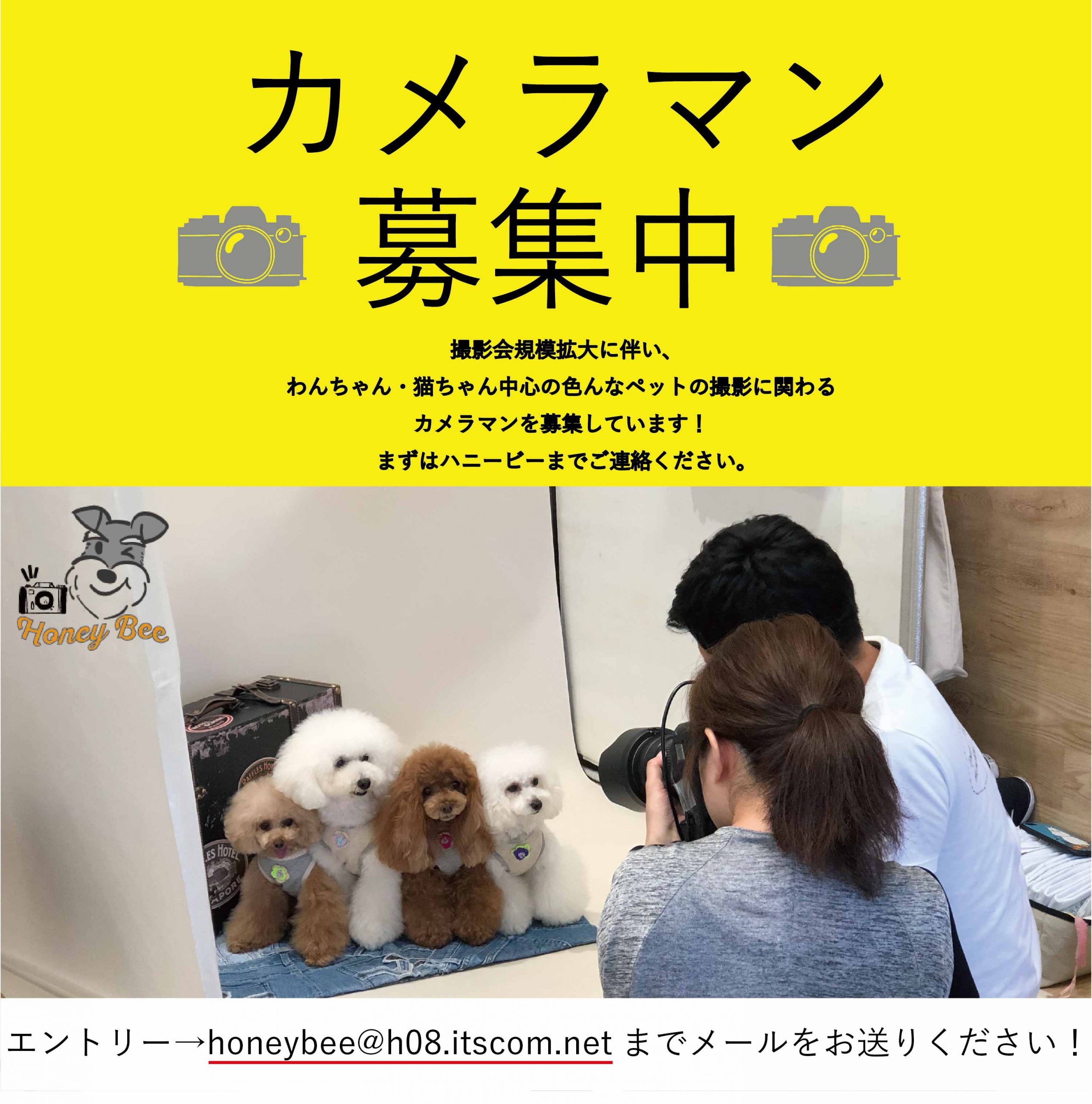 カメラマン募集! ハニービーで一緒に働くスタッフを募集してます。ペットの撮影&サプリメントの株式会社ハニービ。