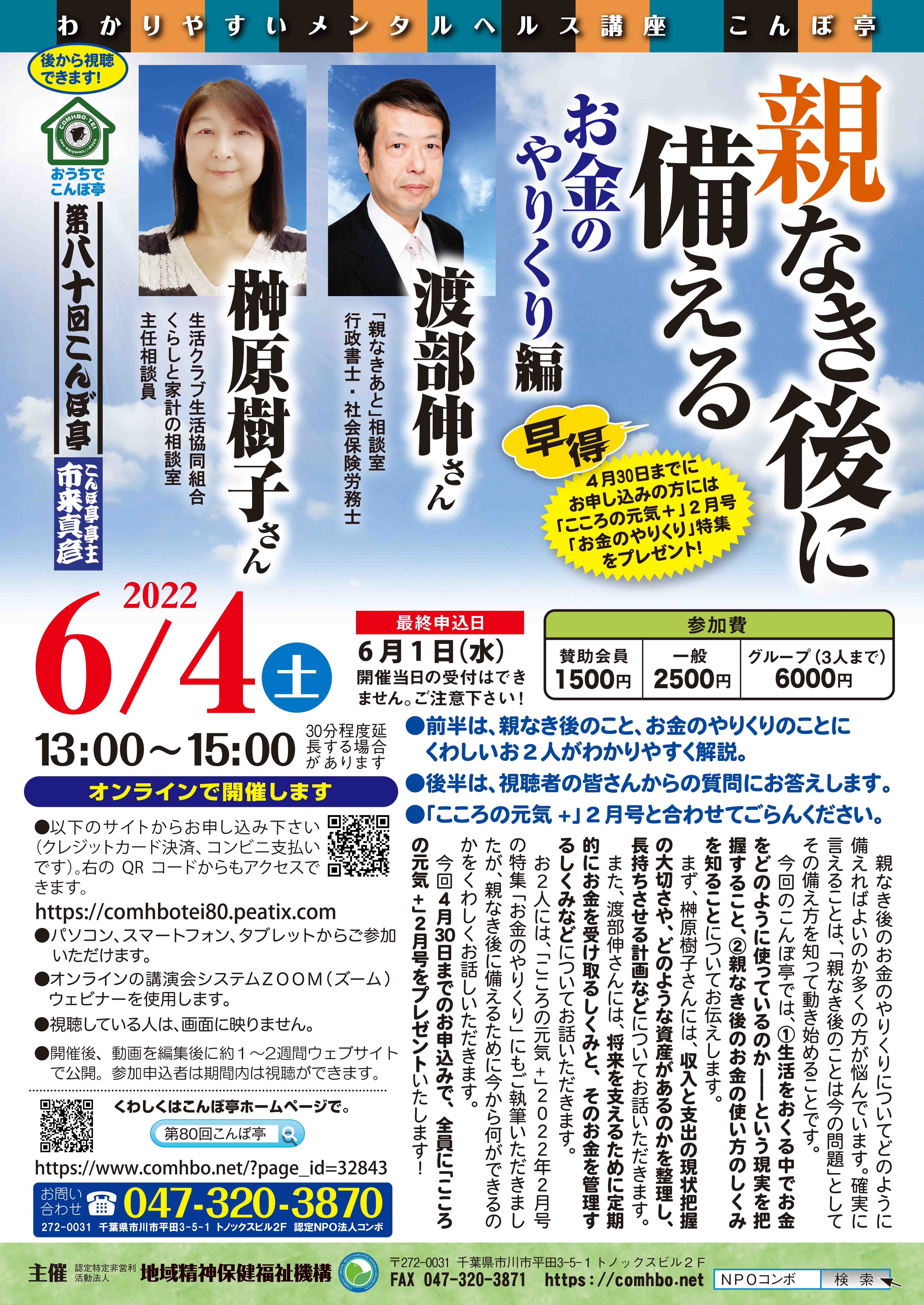 こんぼ亭 6 4 『親なきあとに備える:お金のやりくり編』~申込締切:6 1~認定NPO法人地域精神保健福祉機構・コンボ。