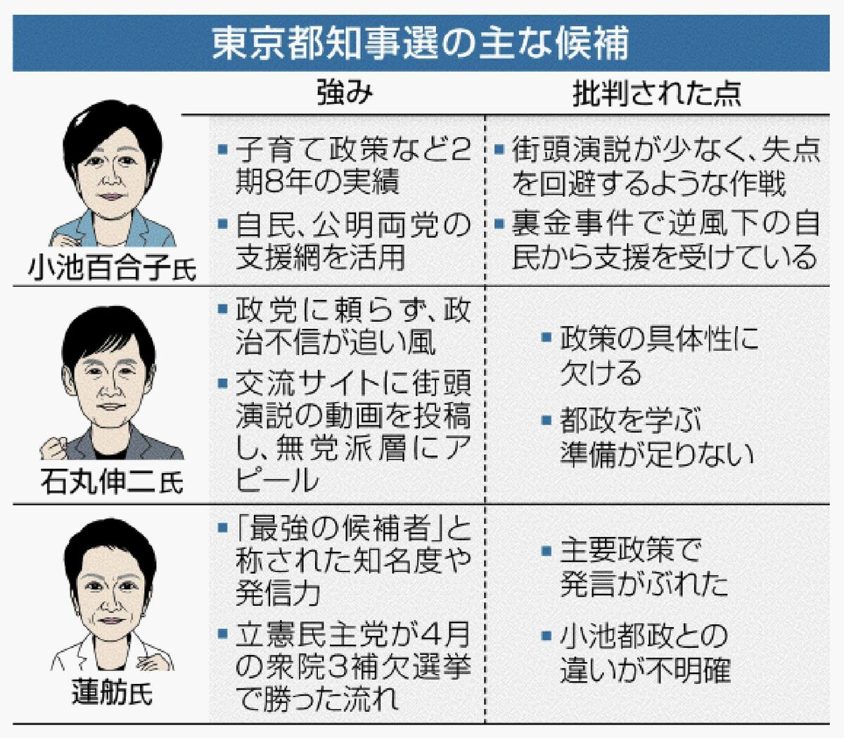 東京都知事選の告示直前、小池百合子氏と蓮舫氏に見えるほころび東京都 :朝日新聞。