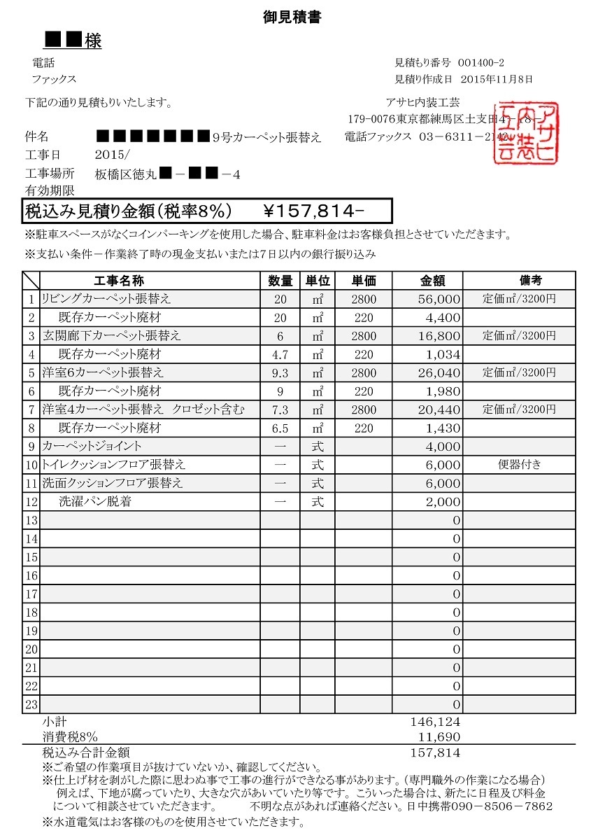 料金・単価表格安なタイルカーペット張替などの床リフォーム。