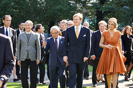 国王王妃両陛下来日初日、無事終了! 晴天に恵まれながら下記のスケジュールをこなしました。 皇居にて歓迎行事→御会見→21_21 DESIGNSIGHT「活動デザイン展」視察→大使公邸にて在京オランダ人コミュニティーのレセプション→愛宕神社&青松寺を訪問→宮中晩餐会。