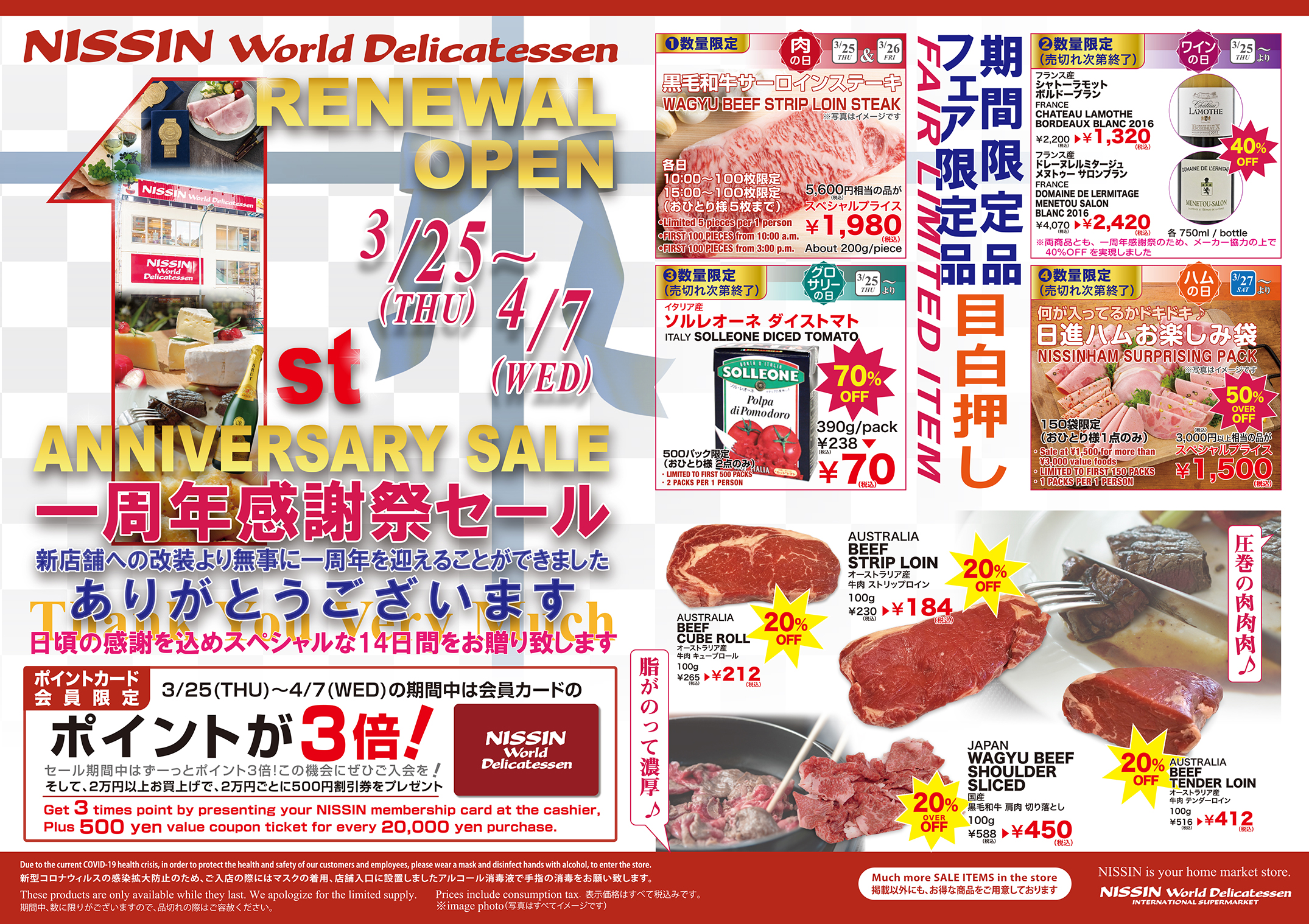 リニューアルオープン一周年感謝祭セールRENEWAL OPEN 1st ANNIVERSARY SALE March 25thTHU~April 7thWEDNissin World Delicatessen 日進ワールドデリカテッセン。