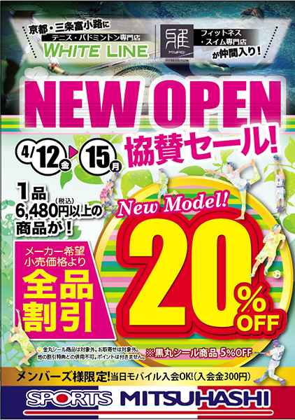 新店OPEN協賛SALE!!4日間のみ!春の全品割引20%OFF!!!スポーツミツハシ京都・奈良でシェアNo1のスポーツ用品店。