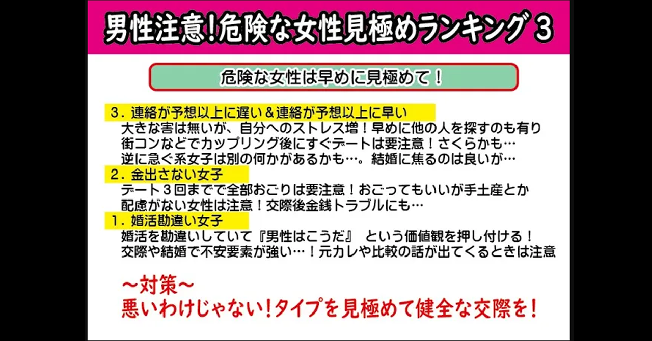 テキスト版 危険な女性見極めランキングTOP3~ 男性注意- 入倉結婚相談所。