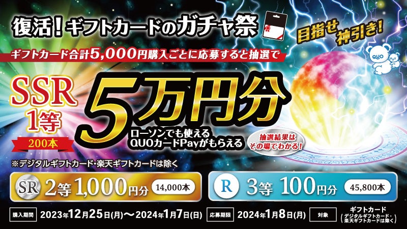 ローソンでギフトカードを購入・応募で最大5万円分のQUOカードPayが当たる!目指せ神引き!「ギフトカードのガチャ祭」を12月25日 月 より開催!株式会社クオカードのプレスリリース。