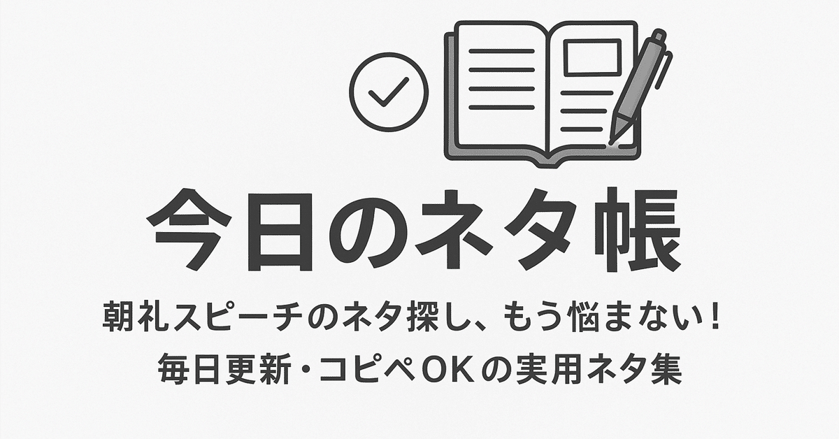 朝礼ネタ・一言テンプレート毎日更新中!1年366日分。朝礼のスピーチにさらっと使えそうなネタやコンテンツだけを集めています。その日に合った時事ネタ を使用しやすいようにまとめています。