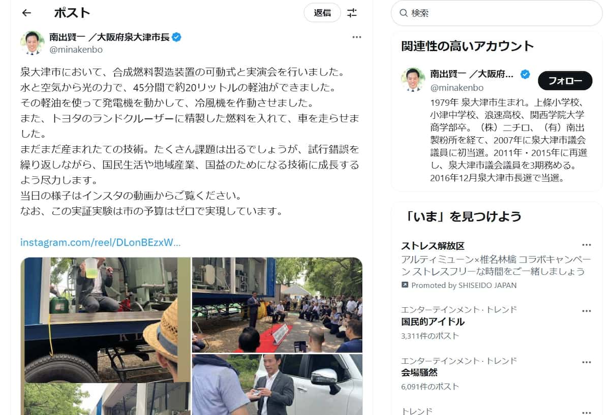 水と空気から軽油」大阪・泉大津市長の投稿が物議 実証主体企業は特許理由に説明避ける - 産経ニュース。