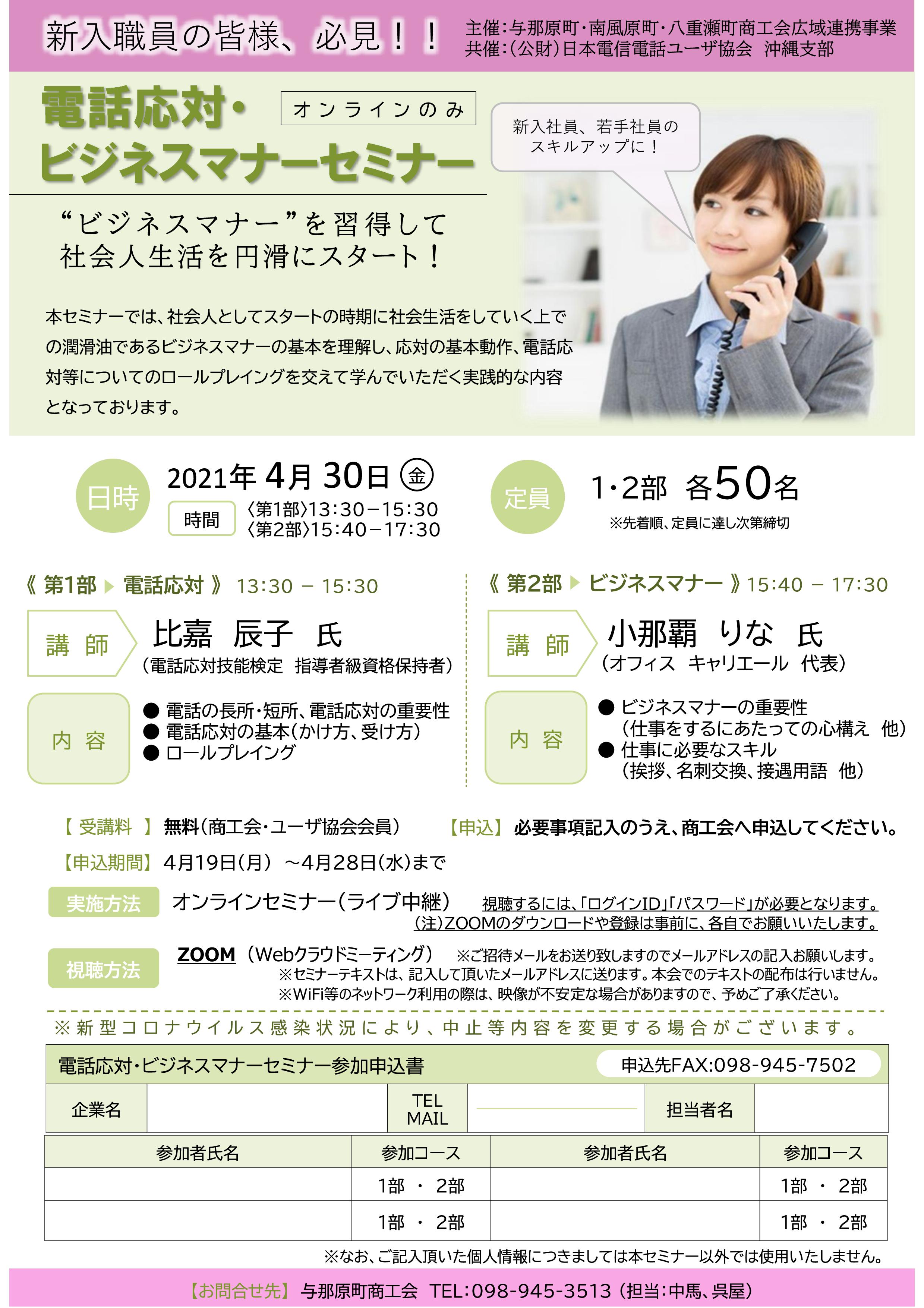 オンライン開催 電話対応・ビジネスマナーセミナー開催のお知らせ - 八重瀬町商工会と会員からのお知らせ。