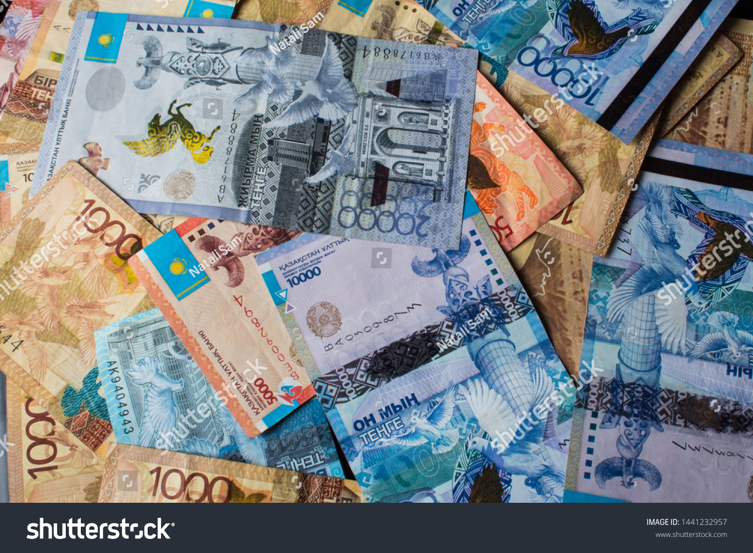 テンゲKZT.カザフスタン,KZの国民通貨。為替レート。経済、開発、ビジネス、銀行、ブローカー。写真素材1441232957Shutterstock。