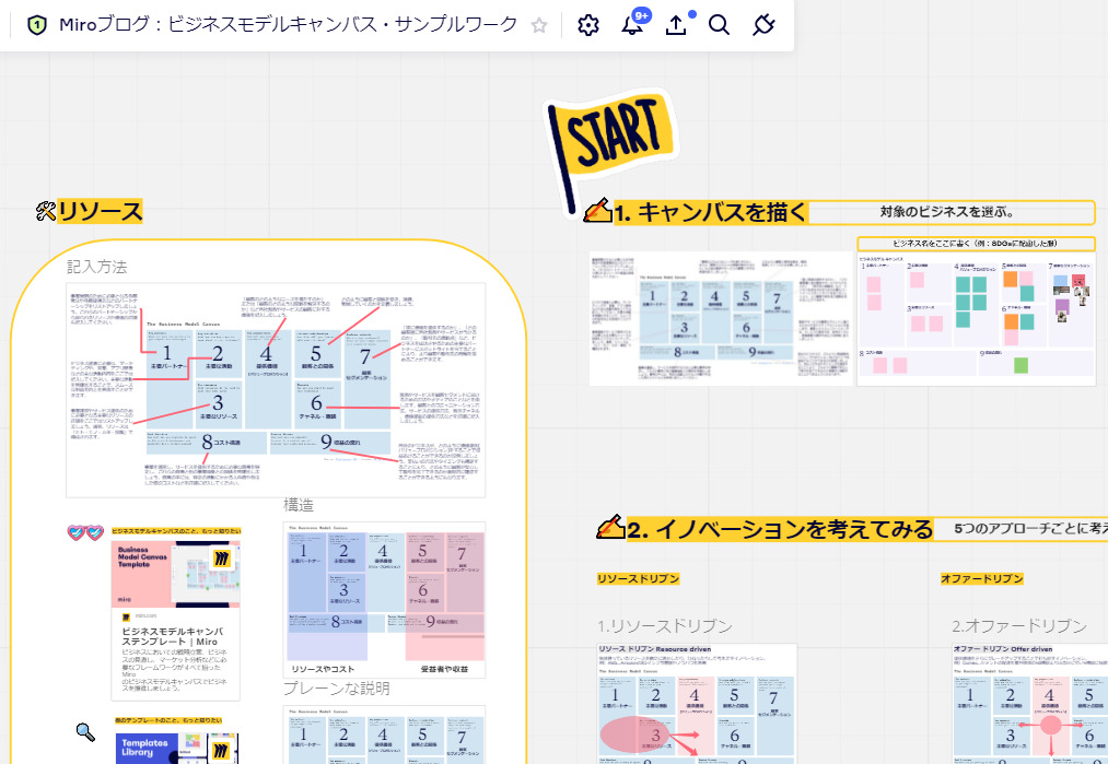 ビジネスモデル キャンバスを描いてイノベーションを語ろう サンプル テンプレートつき- イノベーション ワークスペース Miro。
