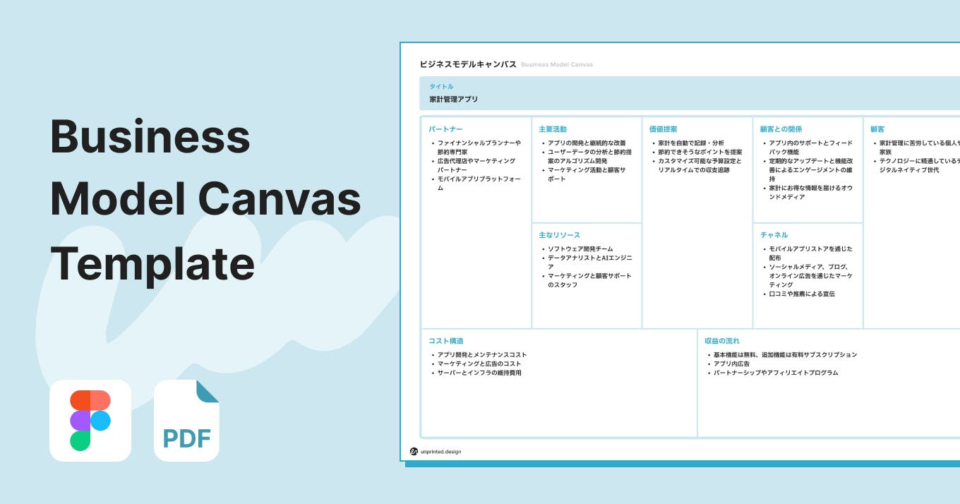 FigmaとPDFで書き込める『ビジネスモデルキャンバス』作成用テンプレート。