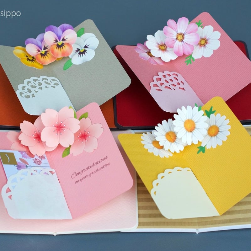 ダウンロード版の型紙 ギフトカードホルダー 花 4種入ポップアップカードPDF。