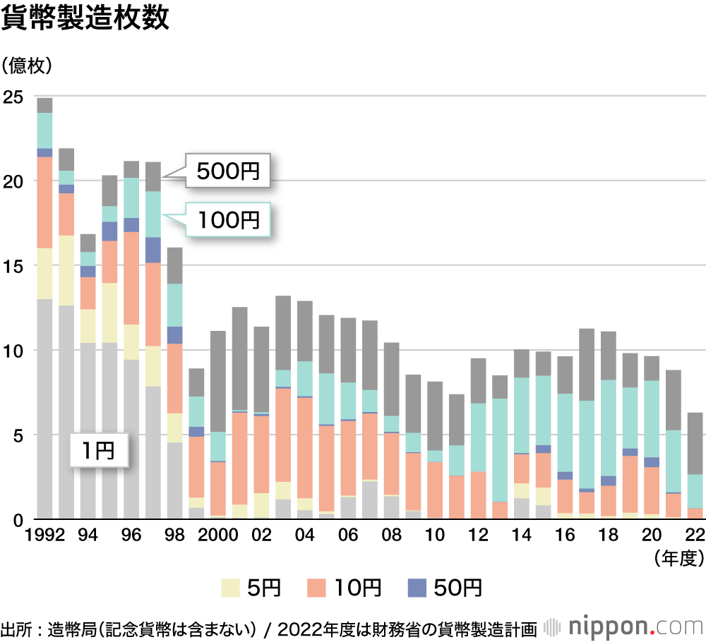 令和」の1円玉を探せ! : 22年度の硬貨製造6.2億枚―キャッシュレス浸透、20年間で半減nippon.com。