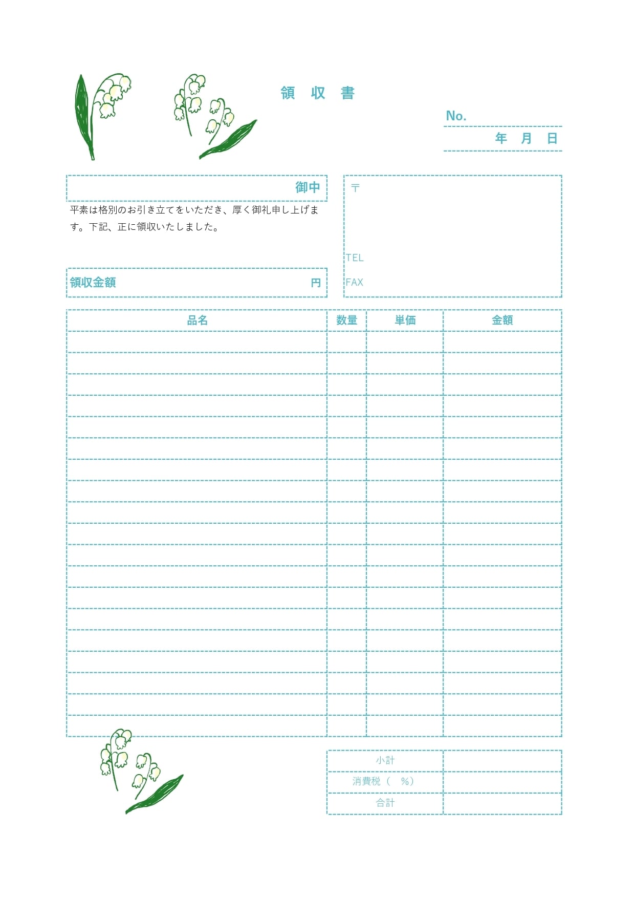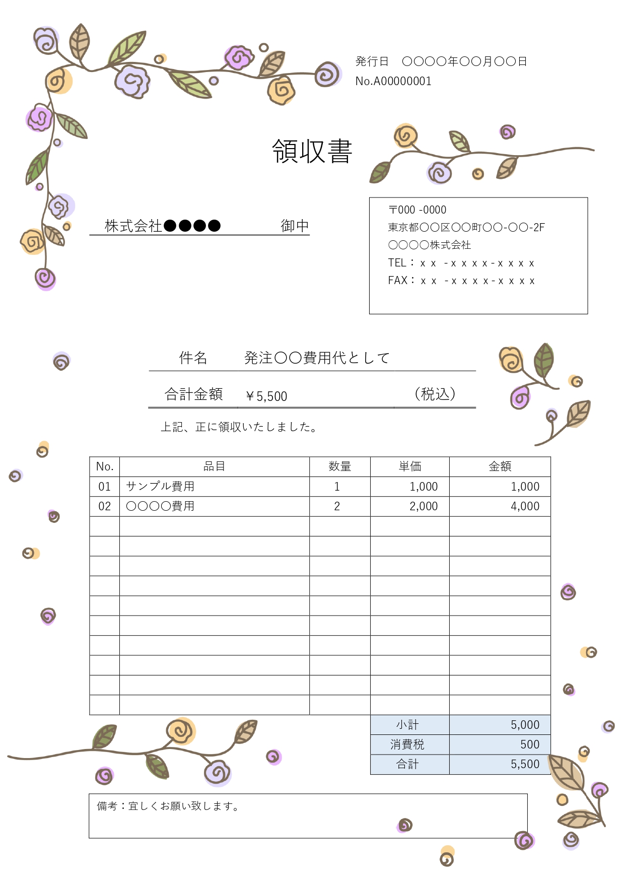 おしゃれ アカシア 収入印紙・手書き対応!A4サイズ縦型の領収書「エクセル・ワード・PDF」無料テンプレートTemplateBox。