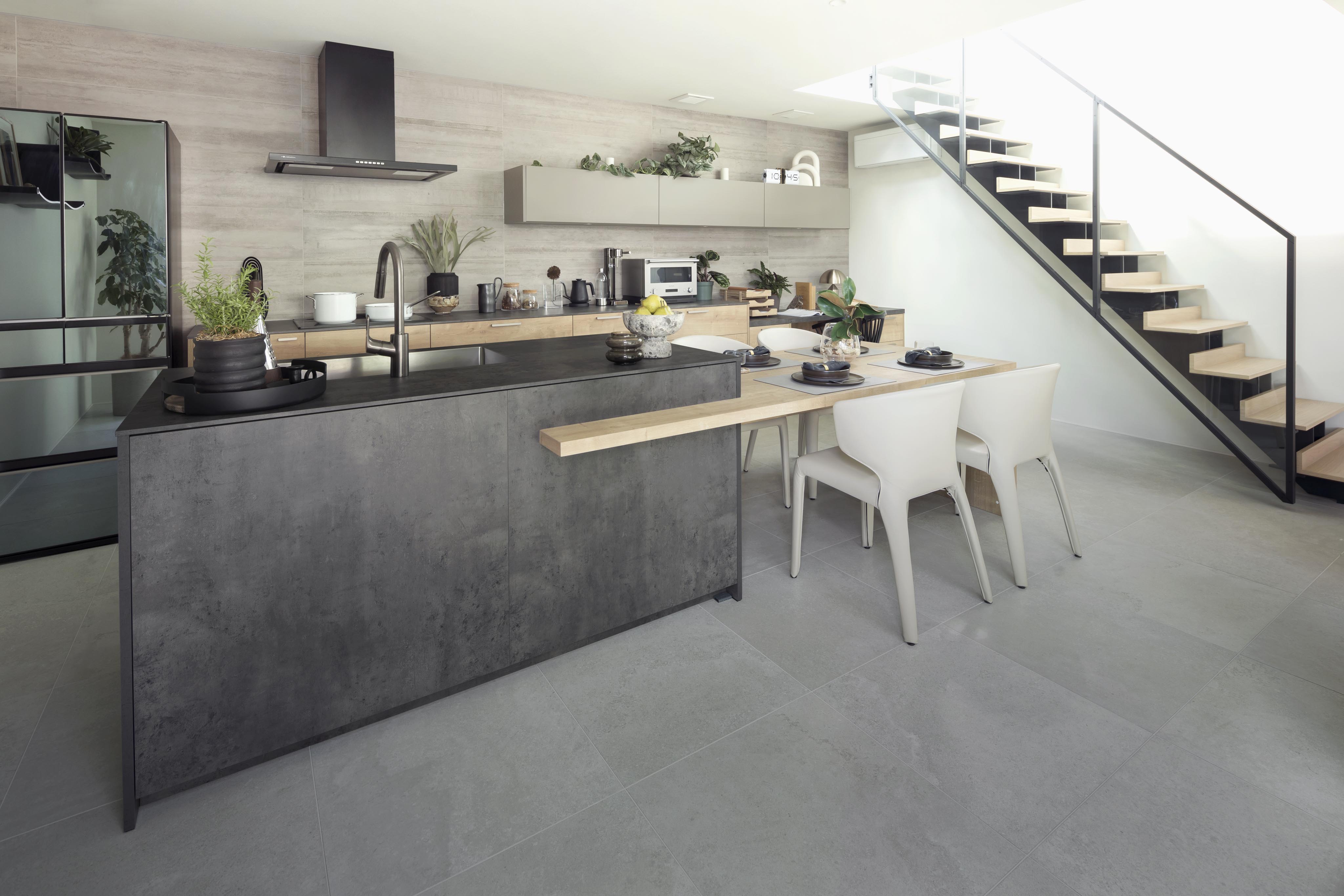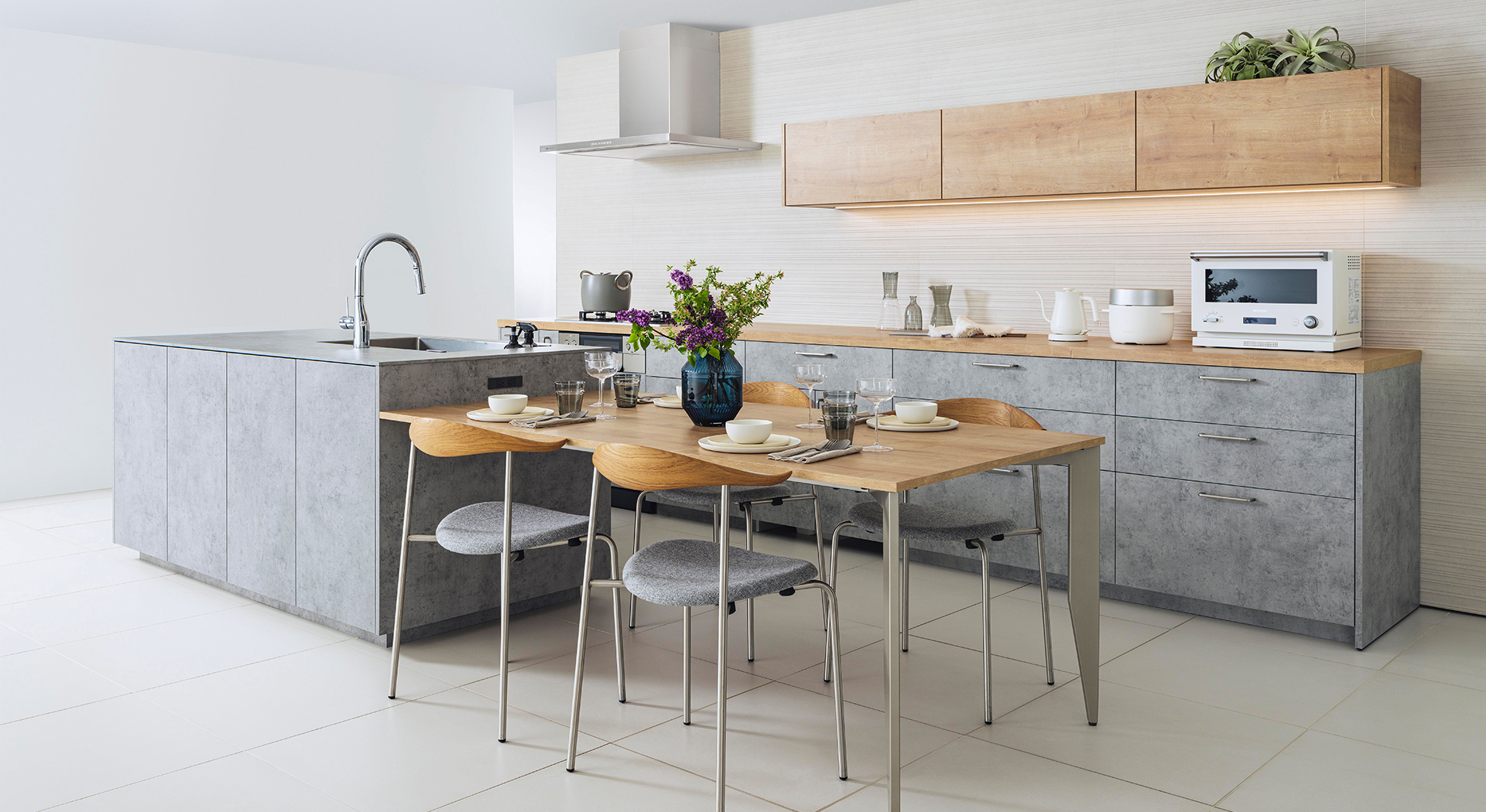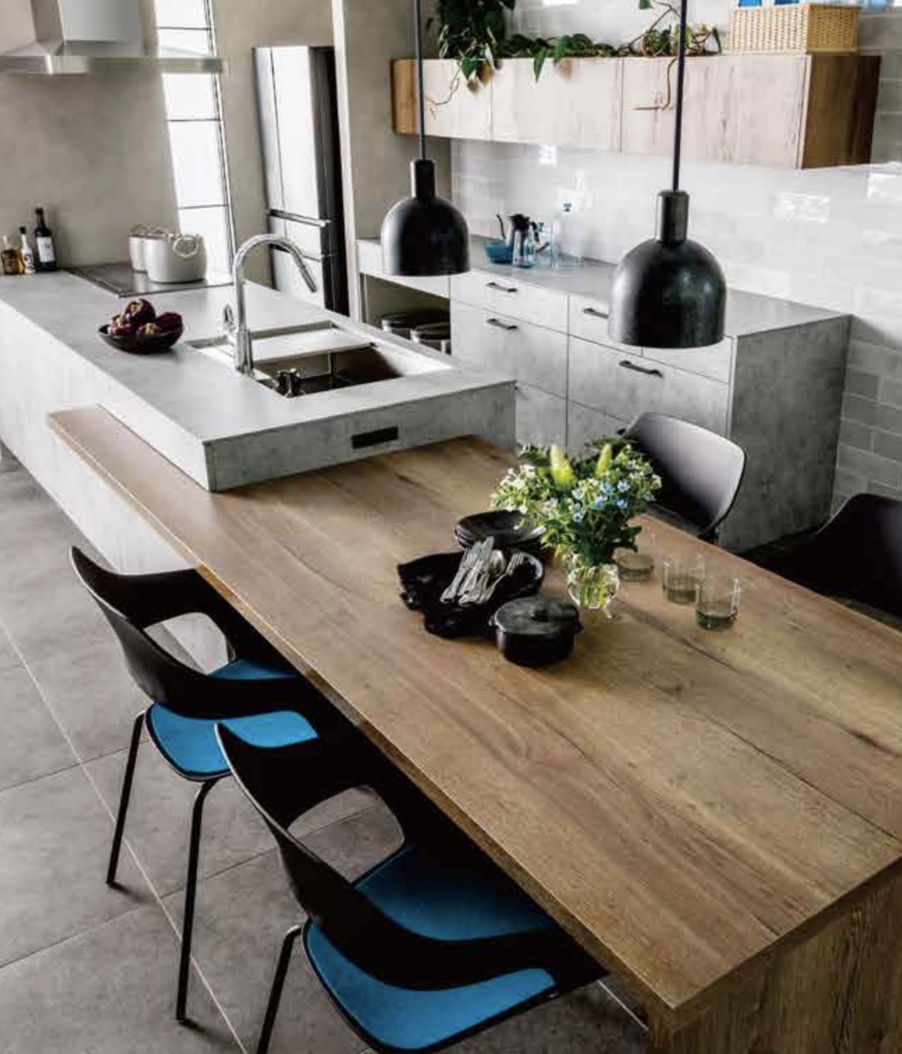 モルタルキッチン のような風合いが特徴の エバルト カラー「 ピアノベトン 」。バックセットの吊り戸部分とテーブルには、同じくエバルトの木目カラー「 ノッティブラウン」をコーディネートし、モダンでありながらナチュラルな印象をミックスしたテイストに仕上げまし。