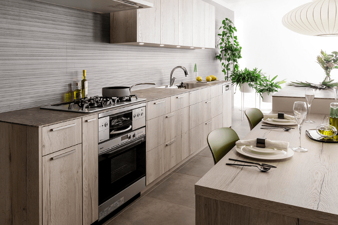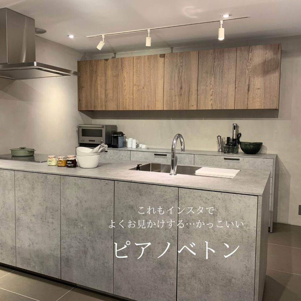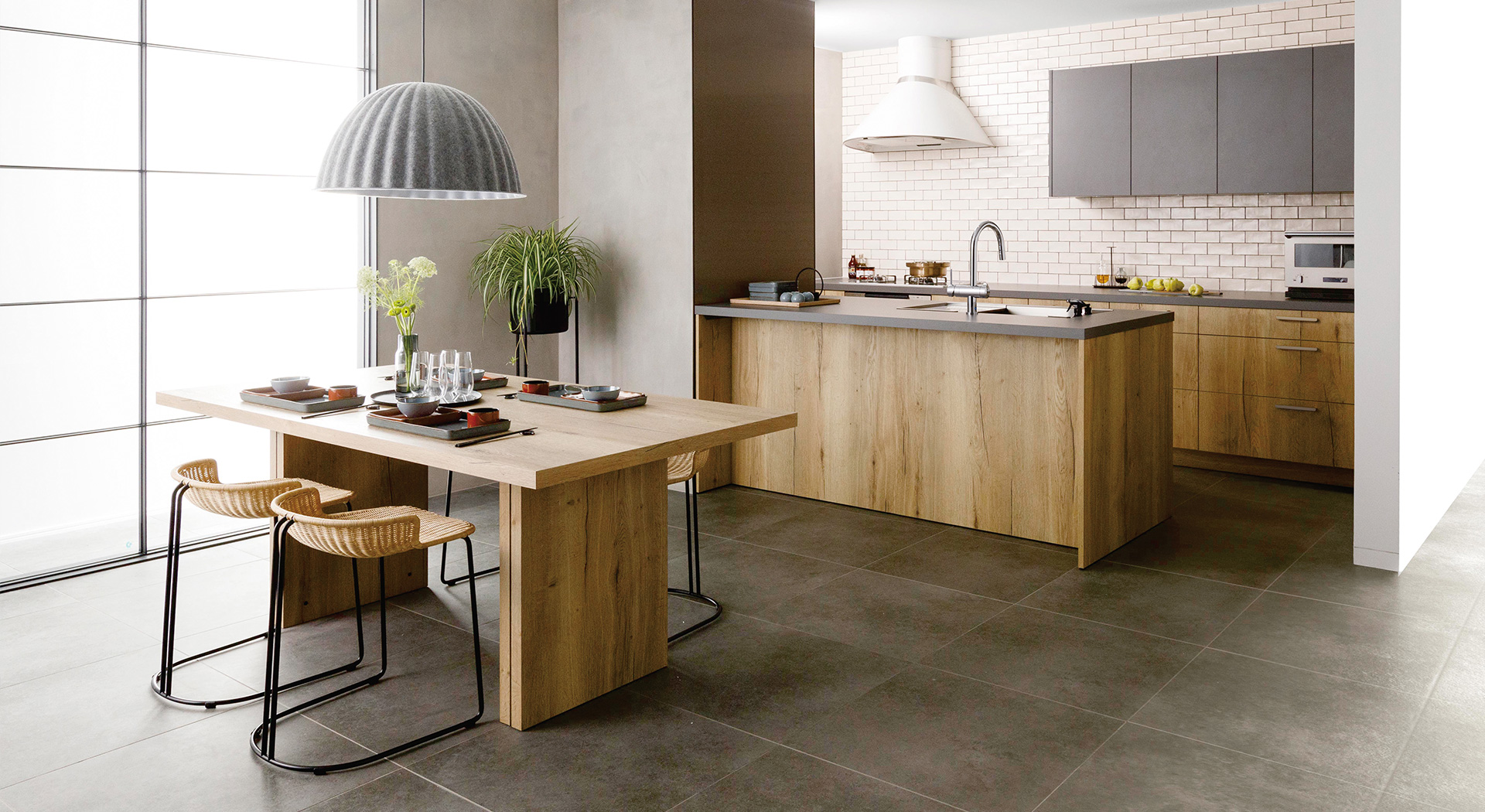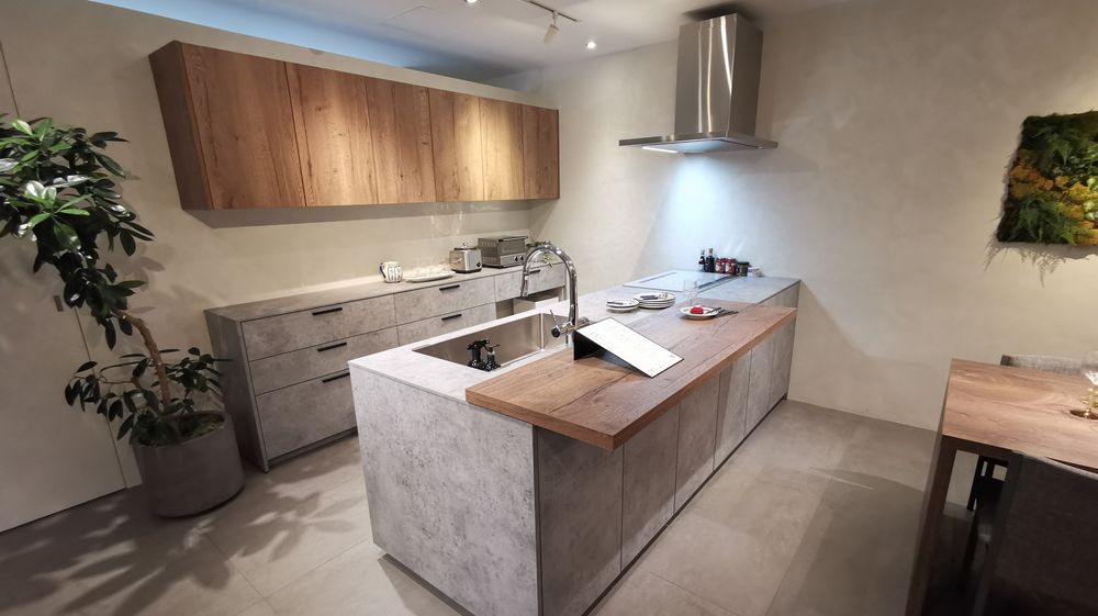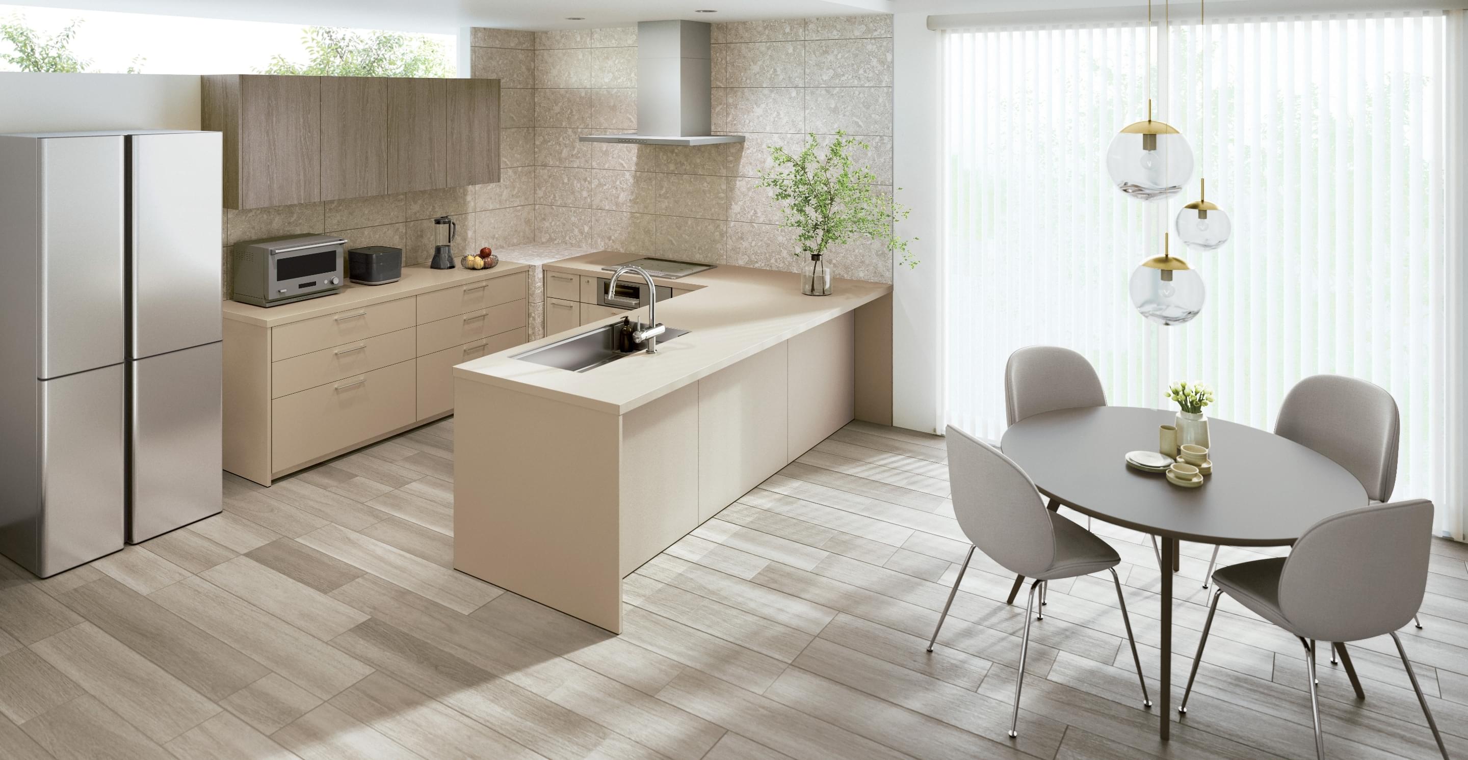 モルタルキッチン のような風合いが特徴の エバルト カラー「 ピアノベトン 」。バックセットの吊り戸部分とテーブルには、同じくエバルトの木目カラー「 ノッティブラウン」をコーディネートし、モダンでありながらナチュラルな印象をミックスしたテイストに仕上げまし。