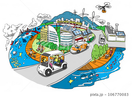 脱炭素社会に向けた環境にやさしいまちづくりの手書きイラスト 都市近郊・カラー のイラスト素材106770083- PIXTA。