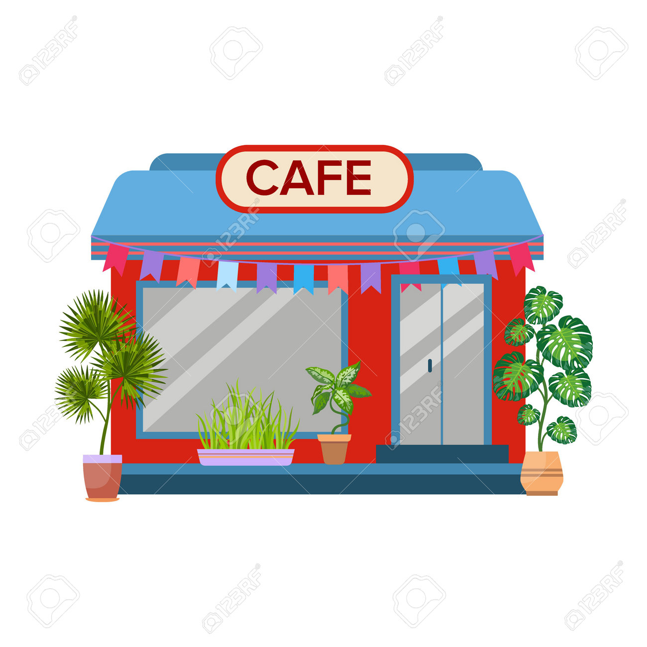 カフェ外観。白い背景に街の通りにある商業ビルのベクターイラスト。地元企業のイラスト素材・ベクター Image 195213821。