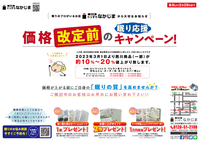 価格改定前の眠り応援キャンペーン!奈良県橿原市の寝具専門店ぐっすりなかじま。