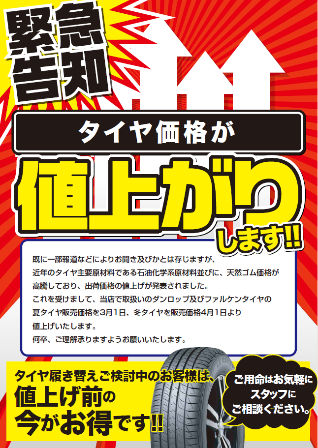 値上げ前がお買得・お知らせタイヤセレクト堺タイヤセレクト・タイヤランド DUNLOP。