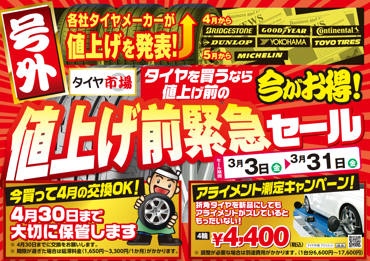 WEB限定チラシ! 値上げ後ですが只今絶賛セール中‼特価の商品、数量限定特価商品ご用意!タイヤ市場佐野店タイヤ・スタッドレス・オールシーズンが安いタイヤ専門店。
