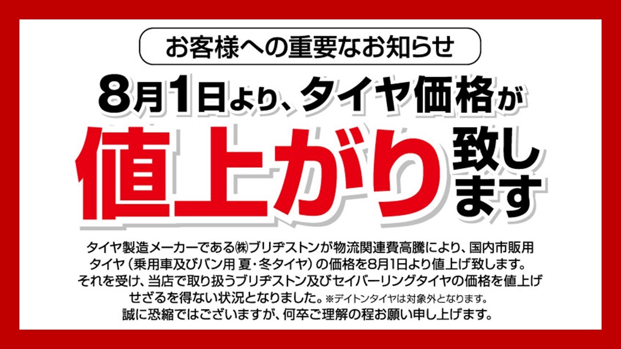 スーパーオートバックス大宮バイパス on X: "何と❗️今年2度目のタイヤ値上げ‼️ 2022年6月24日ブリヂストンタイヤが、驚きの発表🫢夏タイヤ🛞 も、 冬タイヤ🛞も、値上げに2022年4月に値上がりしたばかりなのにさらに値上げ原油価格の高騰や、 原材料 の。