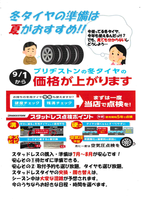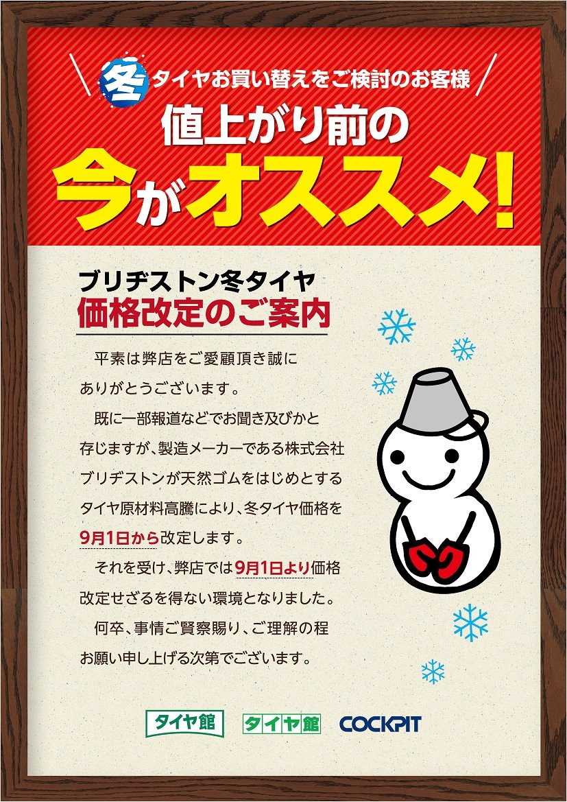 ブリヂストン冬タイヤ 価格改定のご案内店舗おススメ情報タイヤ館 米沢 山形県。