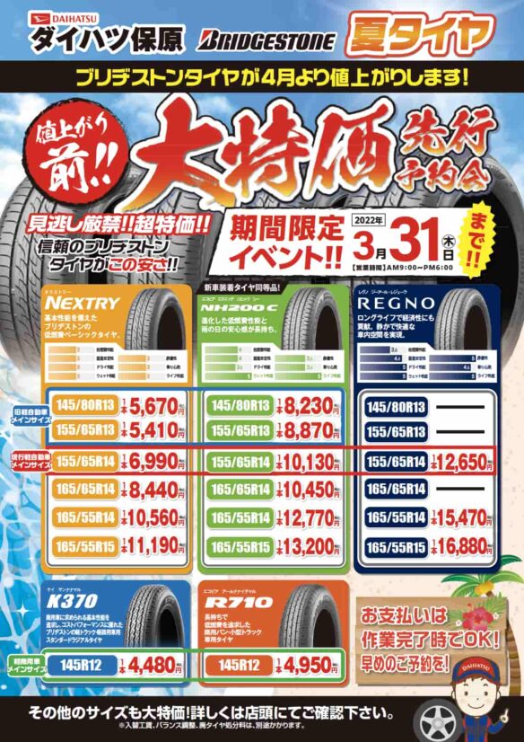 値上げ前のタイヤSUPERセール開催!4月からタイヤ値上げ!この機会にぜひ!EZAKI GROUP エザキグループ。